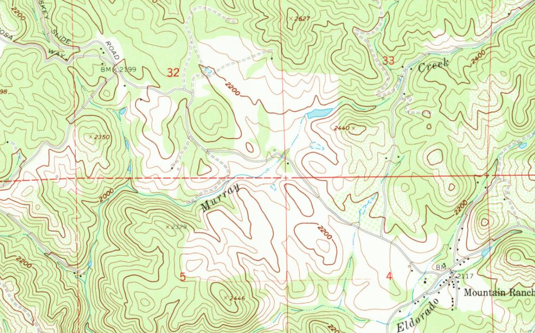 ![]() Moving the exploration North away from Murphys, the above image shows the area around Murrays Creek, Whiskey Slide, and current township location of Mountain Ranch. Mountain Ranch started as the gold camp Eldorado on the banks of Murrays creek. The Spanish pioneers in California had been placer mining for several decades in this bowl of the Sierra foothills well before the 1848 discovery at Coloma. Hence the Spanish Eldorado name. Sometime after the placers were depleted by the rush of '49, the township was re-located a mile southwest to the current location and renamed Mountain Ranch due to a postal address conflict with another larger more politically strong township in California. The point being that the original Eldorado camp sat on the banks of Murrays Creek at an elevation of 2150+/-. The areas surrounding Eldorado camp and trending towards Whiskey Slide, were termed Chee Chee Flat. The miners worked and reworked the Chee Chee flat for several decades. Most of it is treeless as the soil was removed revealing a heavily weathered surface. The occasional nugget is still found here. |