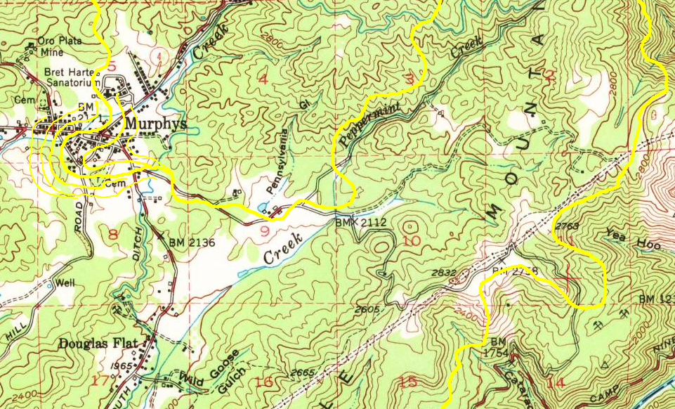 ![]() The Murphy brothers searched upstream from Angels Camp along Angels creek knowing the gold deposited in the creek flats was coming from a greater source. They found the bonanza in the gravels wedged among the limestone blocks of the ancient Eldorado river bottom. These multiple oxbows of the Ancient Eldorado were confined to a geologic bowl and deposited gold for hundreds of thousands of years. The oxbows (in yellow) are shown on both the inner and outer courses of the main path of the old river. The river path exited from under the overburden of soft volcanics north of the current township and after meandering through the township oxbows moves southwest and is covered periodically by eroded volcanics along Pennsylvania Gulch then completely slips under the hundreds of feet of volcanics near the junction of Peppermint and Coyote creek. Most of the gold here was further eroded and washed downstream to Douglas Flat. But some areas were still covered and as late as 1863, well after the golden pile centered on the township was depleted, the miners sunk shafts straight down to depths of a hundred feet to more to reach the gold river bottom. None other than Mark Twain describes the mining activity along Pennsylvania Gulch in his Roughing It chronicle. |
