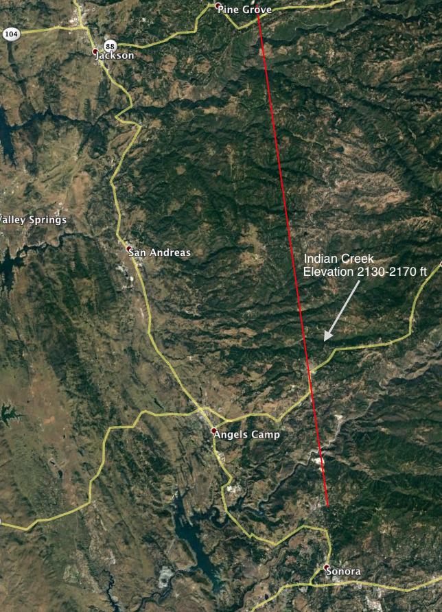 ![]() A line drawn with the GE measure function is shown on the GE screen copy at the left. From Placerville to Sonora the line(s) you can draw trend near 156- 158 degrees and they connect big placer gold strikes generally within 2 miles of the line. |
