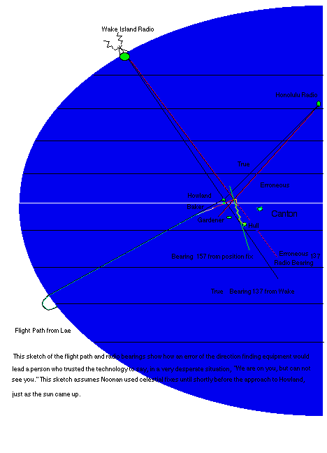 Approach to Howland was behind schedule by 1 1/2 hours and the last celestial fix was getting old and the Itasca homing signal wasn't working for her. But the sun was coming up and they still had 1 1/2 hours to go. A sun shot with the sextant now would be futile. For greatest accuracy, the officer of the watch always takes the sun shot at high noon. A hazy horizon with low cumulus clouds and a tiny sun angle could result in significant errors. Amelia could correlate the lightning flashes in the distance with the crackle of static on the radio tuned to 3105 Kc and the previous daytime flight from Darwin to Lae had proven 6210 Kc good; a simple band switch to 3105 Kc should not be a problem. That and the radio traffic at 6540 Kc ( 45.5 meters as shown on the image) she monitored as they departed Lae gave Amelia confidence that the radio was working properly.They had been impressed by the accuracy of the long range low frequency radio direction finder over the greater part of the circumnavigation. At just short of 1000 miles of the trip, the team had zeroed in on the bright search lights of the ocean going tug Ontario using the loop antenna at 400Khz. Amelia saw the intense search lights of the tug miles away and reported "Ship sighted ahead". They felt confident that the 333Kc homing signal assigned to the Itasca at Howland would be just as accurate. But an unexplained command decision aboard the Itasca, resulted in no homing signal being transmitted. Amelia radioed to ask that the DF steering (333Kc) be turned on. " Give me DF steering " was interpreted by Itasca to mean "Give me a DF steer". It is tragically ironic that 333Kc at Christmas Island today is the homing beacon used for aviators traveling across the Pacific. Itasca simply did not fulfill it's mission of providing a guiding beacon for the flight. The radiomen aboard the Itasca certainly prepared properly according to the ship's log. The 333Kc was tuned on the transmitter and matching antenna for testing. But sometime later, a faulty command decision was made to not transmit the signals as the flight approached. Amelia had observed both the Wake Island radio and Honolulu radio bearings begining to merge towards thier destination. Low Frequency Radio homing using a loop antenna is good for relatively modest ranges. However, at very long ranges triangulation errors can be significant, even using powerful ground based transmitters such as Wake Island DF and Honolulu AM radio. According to the radio direction finder, Fred's last celestial fix and extented dead reckoning had placed them North of thier intended path. Amelia thought stronger than forecast Easterlies had not only slowed thier progress putting them behind schedule but had also pushed them to the left (North) of the intended path. Amelia began to fly to the right while looking for the Honolulu radio null, probably just missing tiny Baker Island in the early morning light. She found the bearing null at just about the same time as the erroneous 137 degree Wake Island radio null. The radio triangulation was in error, but Amelia was unaware. She turned and was flying the supposed and pre-planned "157/337 line", which was the Rhumb line passing equidistant between Howland Island and Baker Island on the aviator's chart and if extented passes directly to Gardner Island. The islands had been surveyed and charted incorrectly decades earlier. A modern rhumb line calculator shows the direct line between the two islands to be 165. So 157 would be close, but in the Pacific, the closer the better. But it didn't matter, for they were on a 157/337 line far away East and South of thier intended landing place. |