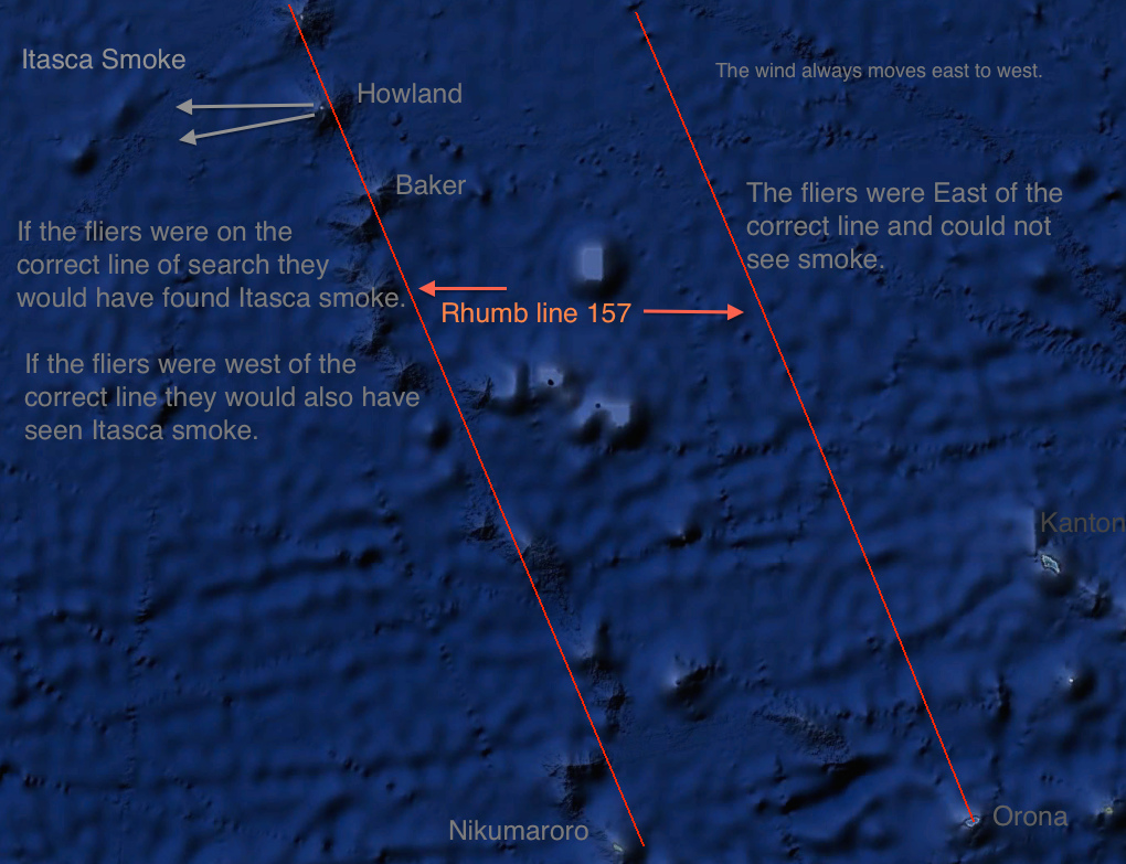 ![]() If the fliers were Northwest of Howland in an area of reported dense clouds, they would have flown South out of the clouds to find smoke from Itasca. Reporting "we are on you but cannot see you", and signal level 5 (strong and clear) radio transmissions means they were flying in relatively close proximity to Itasca and most likely in clear air. |