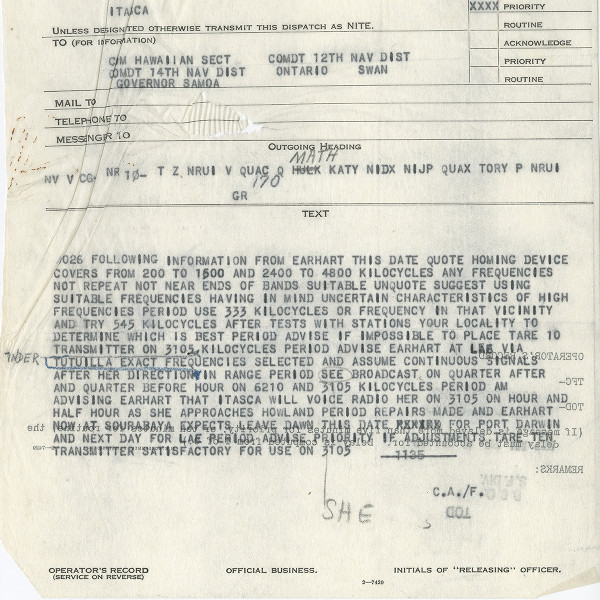 ![]() The message from the CG Headquarters ordering Itasca to transmit a homing beacon on 333Kc and to do so on a continuous basis once Amelia came within radio range. Amelia requested that the radio homing be turned on, but the Itasca command misinterpreted that to mean she wanted a DF steer command from Itasca. |